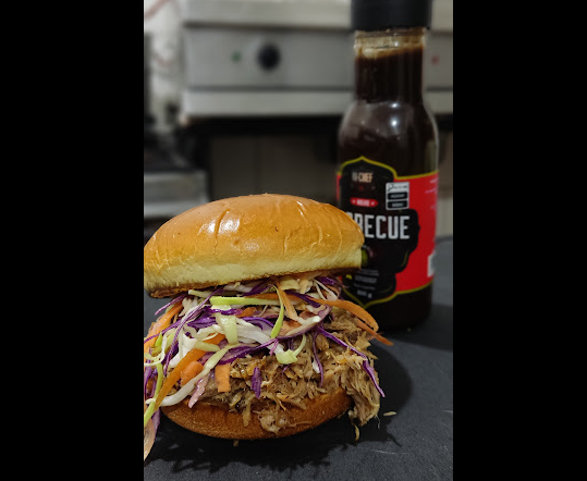 Sanduíche de pulled pork com paleta suína defumada lentamente na Pit smoker com lenhas frutíferas, desfiada à mão para garantir maciez e suculência. Servido no pão brioche artesanal, levemente adocicado e amanteigado, acompanhado de salada coleslaw crocante e refrescante, que equilibra perfeitamente o sabor intenso da carne. Finalizado com molho barbecue artesanal para um toque defumado e agridoce.